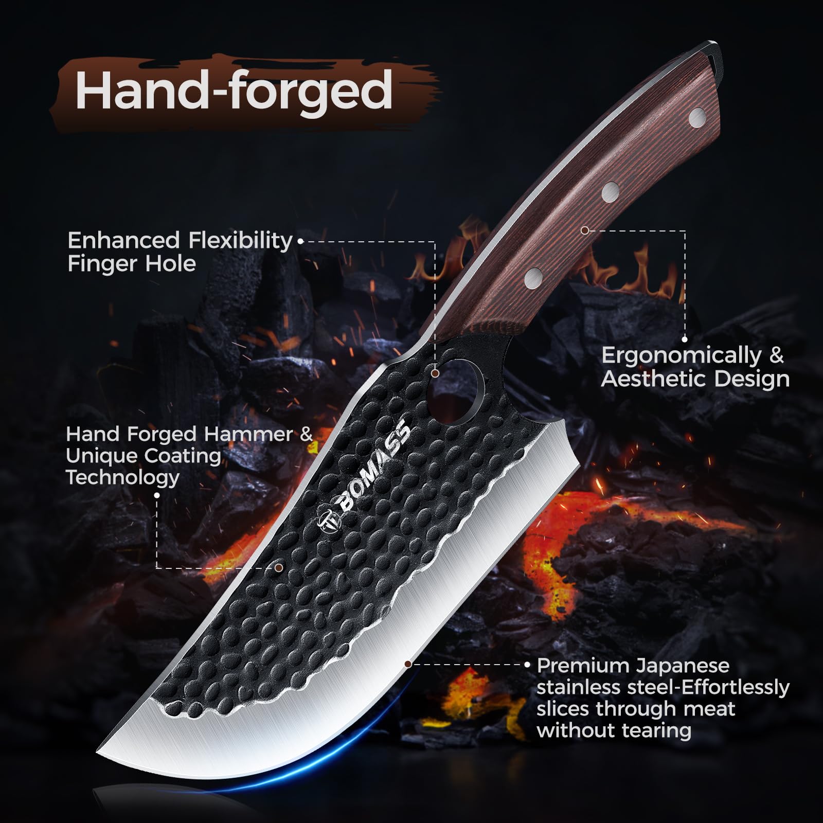 - 【Premium Steel Japanese Knife】 The BOMASS hand-forged japanese kitchen knife is crafted with exceptional precision, offering unique resistance to corrosion. Known for its superior sharpness and durability, this high-quality meat cleaver knife maintains its edge for an extended period, allowing for precise and smooth cutting. To keep your camping knife set in optimal condition and prevent rust, we recommend hand washing and thoroughly drying each knife with a clean cloth.
