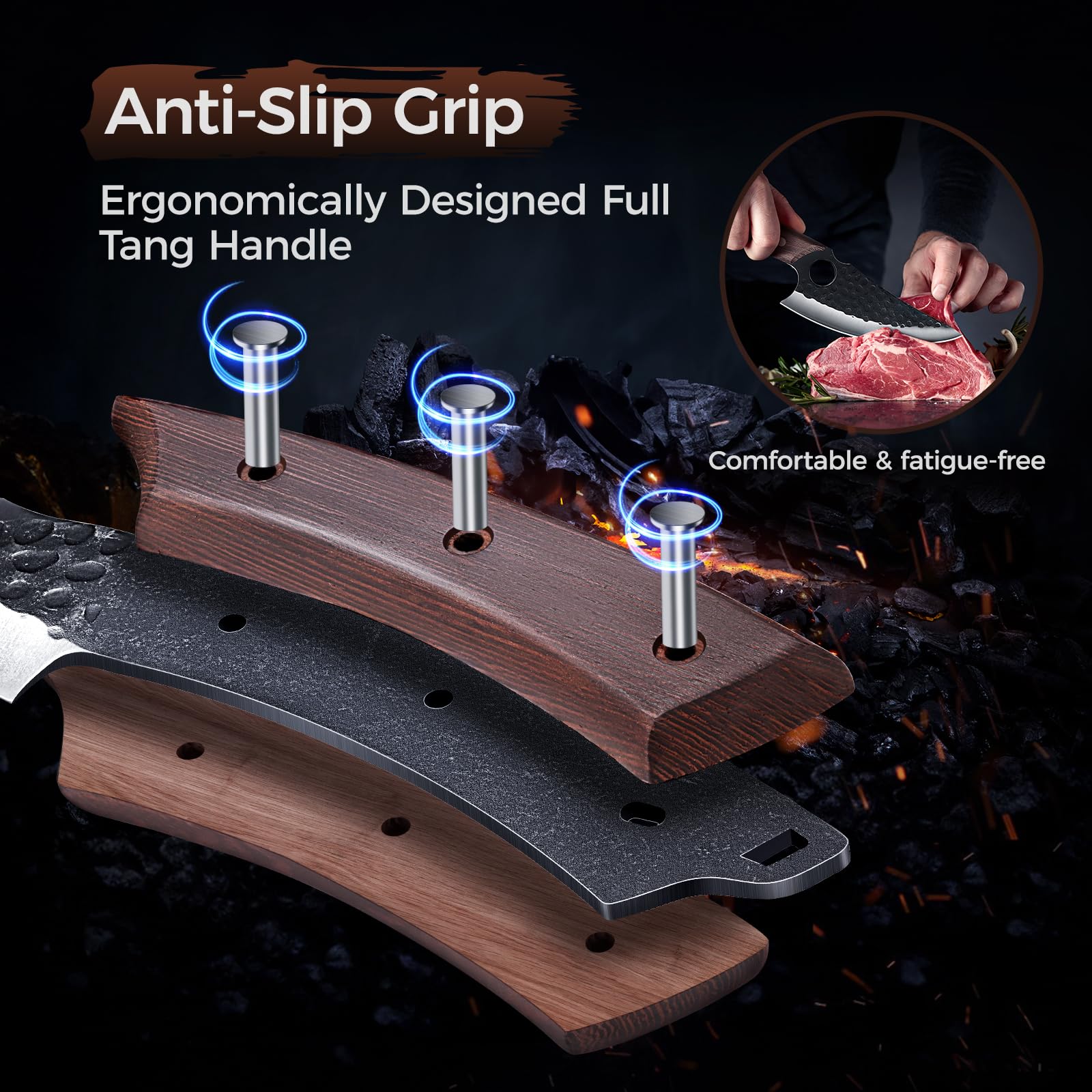 - 【Ergonomically and Anti-Slip Handle】 With a well-balanced design and a curved handle, this cleaver ensures a comfortable and ergonomic grip, making it easier to use during extended periods. The blade holes and wooden handle provide non-slip and shock-absorbing features. The full-tang handle with rivet construction significantly enhances the stability of the knife set, contributing to both safety and durability.