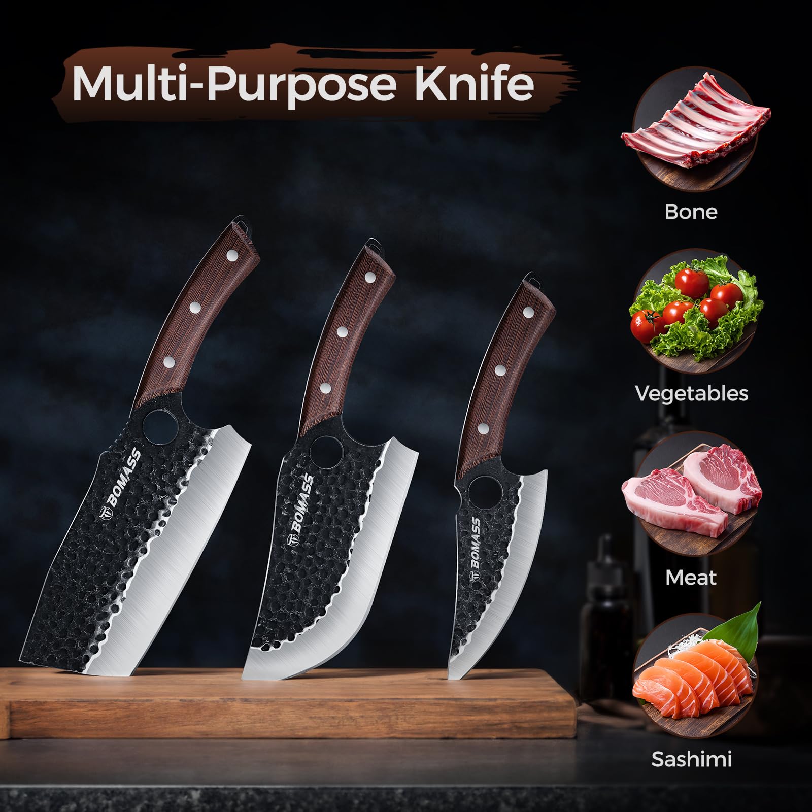 - 【Multifunctional Butcher Knife Set】 BOMASS chef knife set includes a 6.1" Viking Knife, a 7.4" Meat Cleaver, and a 7.4" Serbian Chef Knife, making it a versatile choice for any kitchen. Whether you're chopping vegetables, slicing fruits, or cutting through meat and bones, this set has you covered. The BOMASS meat knife is ideal for various settings, including home kitchens, restaurants, markets, outdoor BBQs, camping trips, hiking, cooking classes, and even boat kitchens. It truly meets all your needs in any situation.