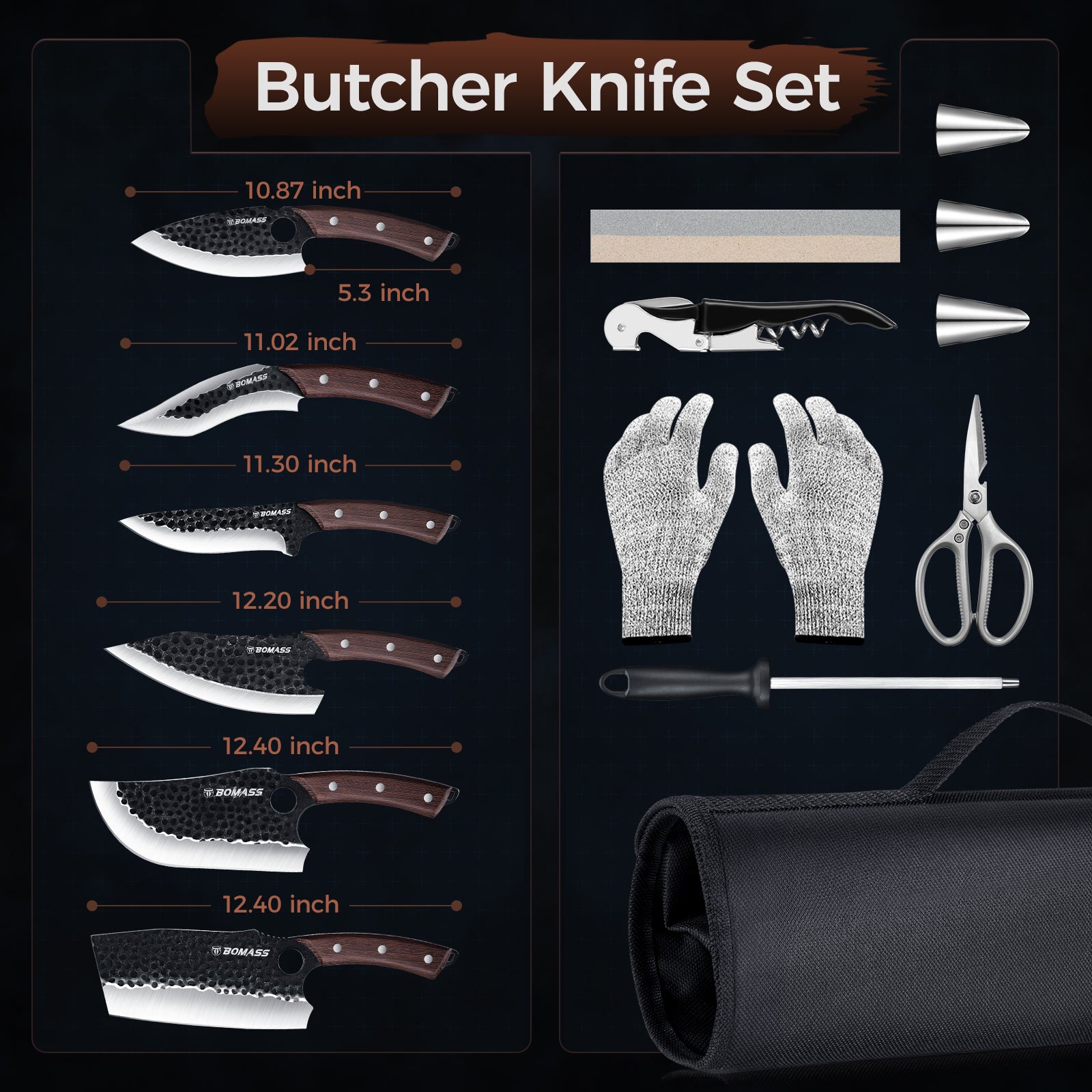 Meat Cleaver Butcher Knife Set of 13, Hand Forged Santoku Knife Kitchen Knives Set, High Carbon Steel Boning Knives for Meat Cutting with Roll Bag & Accessories Kitchen BBQ Gift for Men